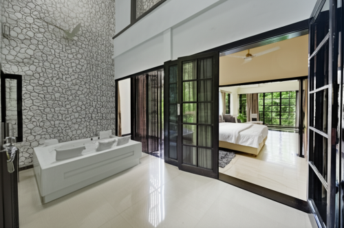 gray and beige paint, decorative stones on columns, white framed aluminum windows, solid wood entrance door, mahogany trees at the back, landscape at the front with plants, blue cast skies, make road for the garage, ferrari in the garage,