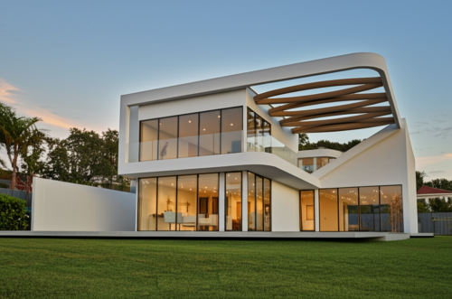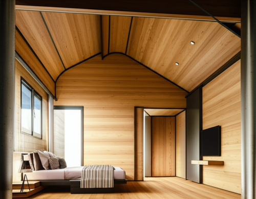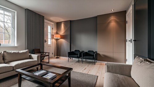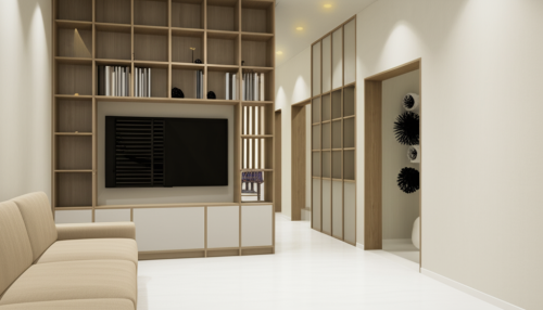 Luxury, new construction condo in Washington DC. View of the kitchen. Kitchen features white countertops, Formica planked coffe oak by formica cabinets, a kitchen dining table matching the color scheme of the rest of the kitchen.