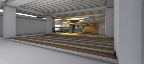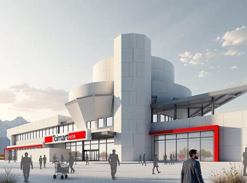 This view into a modern beach house kitchen shows a fridge and tall cabinets on the back wall. The tall cabinets have a solid oak border and light grey face boards and doors. The peninsula in view is light grey and has a solid white marble worktop with a grey vein.