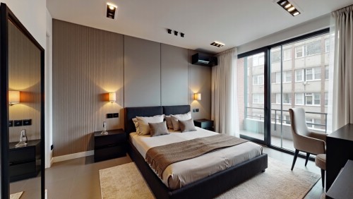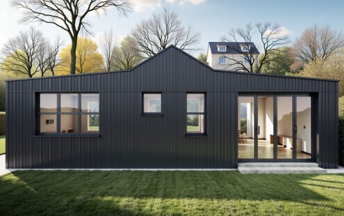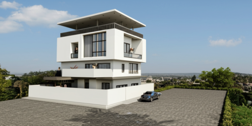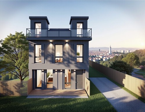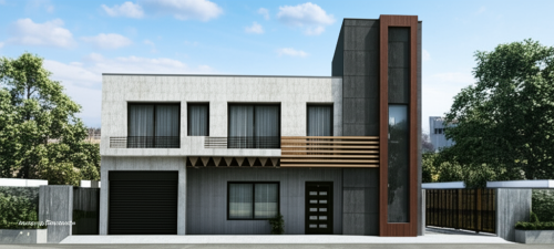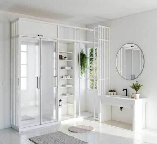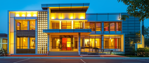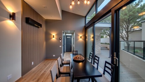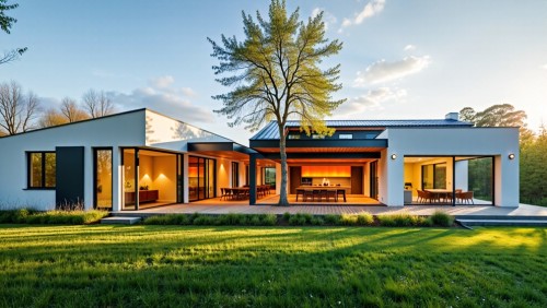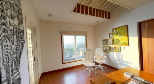 main office area. Ceiling is open and exposed ductwork is painted black above the hanging LED strip lights. 4 desks in pods, conference table with seating for 4-5. cabinetry for storage and TV for presentations. large markerboard on wall to the right. desks and cabinetry is all white. wood accents and greenery, scandinavian vibe. natural materials. energetic and inspiring space with inspirational artwork. flooring is grey carpet. add shelving and lighting and art to be inspiring . change conference table to round table with cabinetry and TV along the same wall