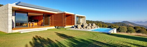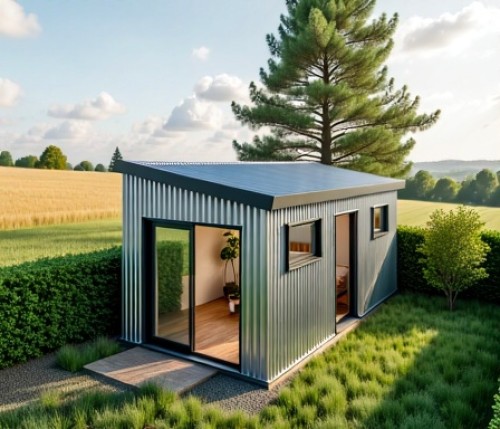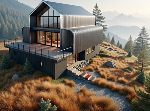 Create an image of the Toimart supermarket building in Kazakhstan based on the provided photo, but in an ultra-modern style that emphasizes environmental friendliness, technology and national identity of Kazakhstan. Keep the general composition of the scene (angle of view, location of the building, mountains and sky in the background), but completely update the design of the building and its surroundings