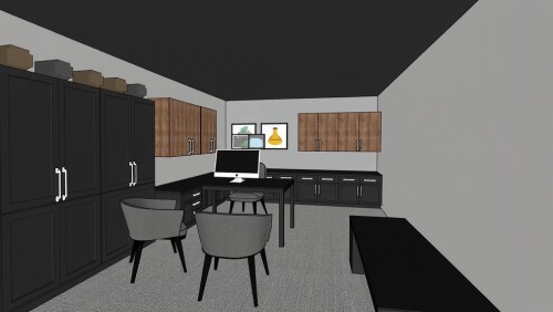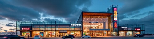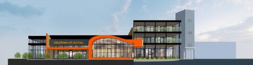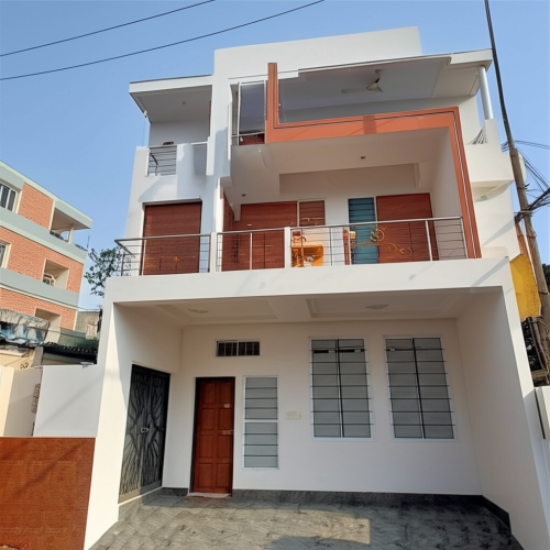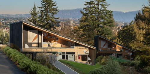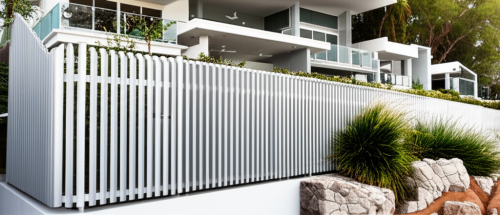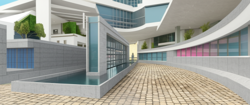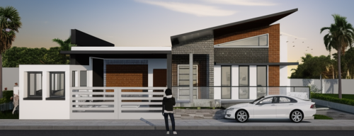modern design, morning scene, white, grey, brown color, palm trees, clouds in sky, minimal lighting, human, car, coconut tree
