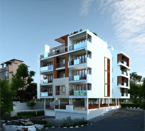 modern design, morning scene, white, grey, brown color, palm trees, clouds in sky, minimal lighting, human, car, coconut tree, road