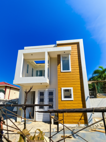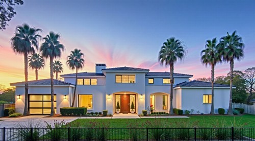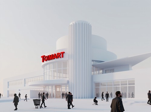 An ultra-modern restaurant with a minimalist influence, with warm gray concrete and leather booths and cooper accents. A bar in the background with turquoise accents.