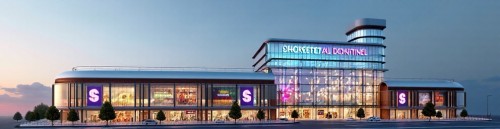 Create an image of the Toimart supermarket building in Kazakhstan based on the provided photo, but in an ultra-modern style that emphasizes environmental friendliness, technology and national identity of Kazakhstan. Keep the general composition of the scene (angle of view, location of the building, mountains and sky in the background), but completely update the design of the building and its surroundings