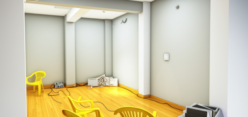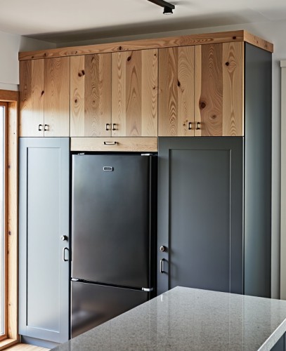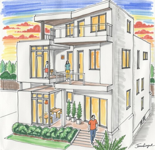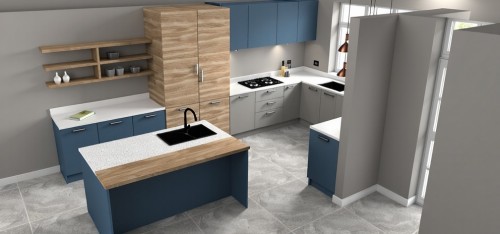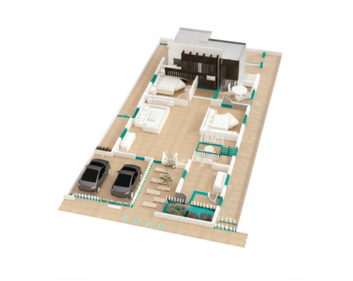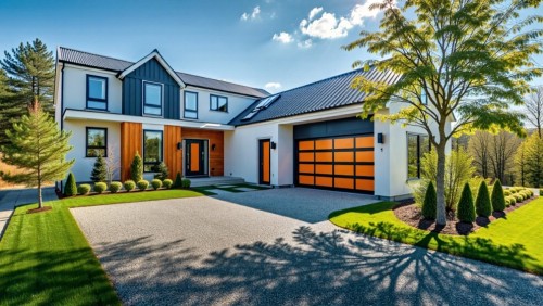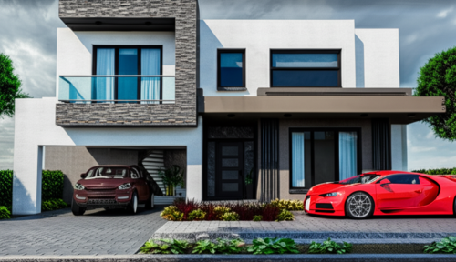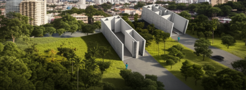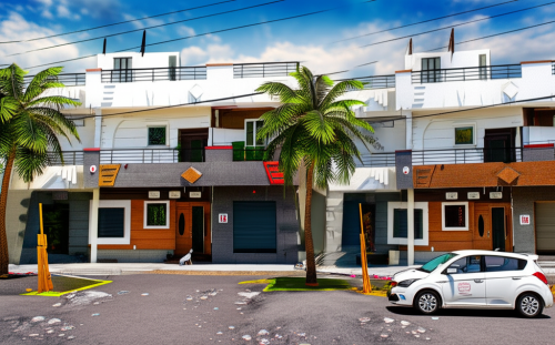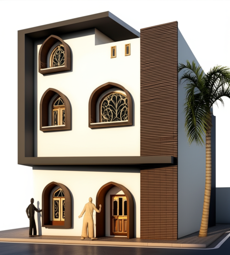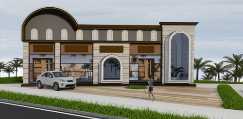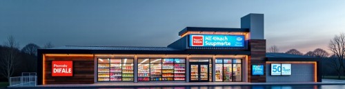 Reconstructed supermarket building in a modern style, preserving the main features of the original facade. Improved design using renewed materials - glass, metal, wood. The facade is equipped with dynamic LED lighting, emphasizing the architecture of the building, creating a volumetric effect. The entrance area with warm neon lighting, attracting attention. The roof is decorated with a stylish luminous sign Toimart, noticeable from afar. Stained glass windows with soft interior lighting create a cozy atmosphere. The parking lot is illuminated with modern LED lights, ensuring safety and comfort. The design reflects a balance between technology and brand recognition.