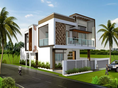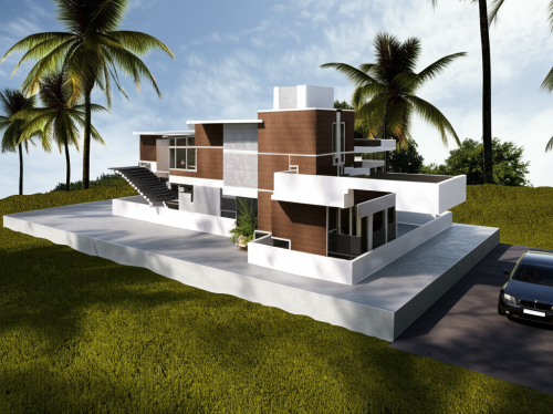 Render an image in tropical context with lots of tropical trees and plants on both the sides and back of the house. Tropical garden on front and ground covered with stone and buffalo grass.