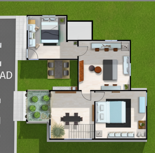 Design Prompt: Warm Modern Dining Area A contemporary dining space designed in a sophisticated palette of black, grey, and white, complemented by earthy tones for a warm and inviting ambiance. The centerpiece is a sleek dining table with a dark wood or black finish, surrounded by upholstered chairs in neutral shades like beige or light grey for added comfort. The walls feature a soft matte grey or off-white paint, with one accent wall in a textured or paneled finish in an earthy tone. Warm ambient lighting is achieved through elegant wall-mounted sconces and a statement ceiling fixture, such as a modern chandelier or pendant lights, positioned above the table. The flooring is either polished wood or light-toned tiles, with a subtle area rug underneath the dining table to define the space. Decorative elements, such as a centerpiece of natural materials (e.g., a bowl of dried botanicals or a ceramic vase), enhance the earthy feel. The overall design prioritizes clean lines, cozy lighting, and a balance of modern elegance with warmth, perfect for intimate gatherings or family meals. REMAIN DOOR POSITION DO NOT CHANGE OUTSIDE BACKGROUND OR VIEW