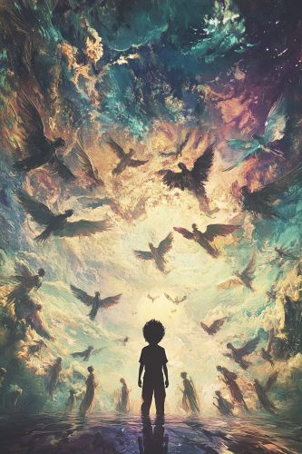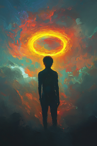 autostereographic and melancholic style, it shows a dark ghostly silhouette, he has an shining yellow angle ring above his head, the sky looks like if you mixed up all diffrent rainbow oil colors, melancholic art and a whole lot of sureality, --ar 2:3 --v 6.1