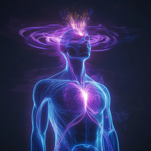 Silhouette of a man sitting in the lotus position. Front view pose. The head is slightly tilted upward. The body shows multi-colored thin channels throughout the body. thin threads show the silhouette of the lungs and heart. From the head there are bright flashes of energy, golden and multi-colored, moving into outer space in the background. A man sits on a hemisphere and channels of colored energies are reflected down to the ground. A bright picture. implement, cinematic lighting, hyper realistic, volumetric, 8k --v 4