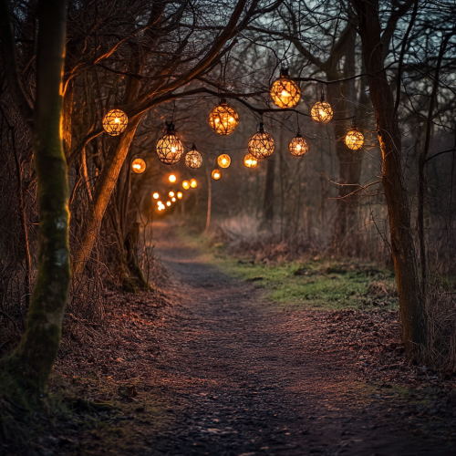photo 8k très réaliste au lever du soleil, un chemin éclairé par des bougies et des lanternes, des lanternes suspendues aux branches des arbres sont éclairées doucement, des lanternes éclairées sont posées sur le sol. Atmosphère magique et chaleureuse. Quelques petites citrouilles posées sur le long du chemin, des des guirlandes lumineuses accrochées aux branches apportent un côté enchanté, ambiance sereine,