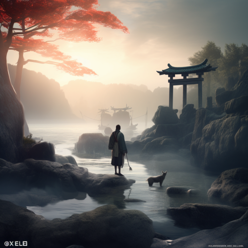 Generate characters for a digital matte painting set in a peaceful Japanese coastal scene at dawn. Add a traveling monk approaching a Torii gate, with warm sunlight casting shadows. The monk wears traditional Japanese robes and holds a staff. In the background, add a faint, mythical fox spirit floating near the rocks. Ensure the characters have a blurred background for easy Photoshop editing and maintain consistency with the sunlight direction --v 5.0