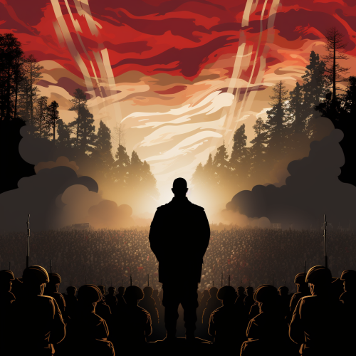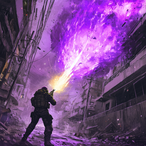 a soldier screaming a the sky while standing in the streets of a delidated city. The soldier is surround by a purple yellow and black dragonball z type aura. --ar 1:1