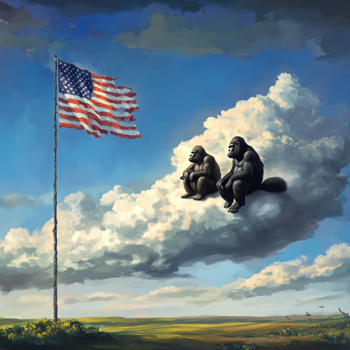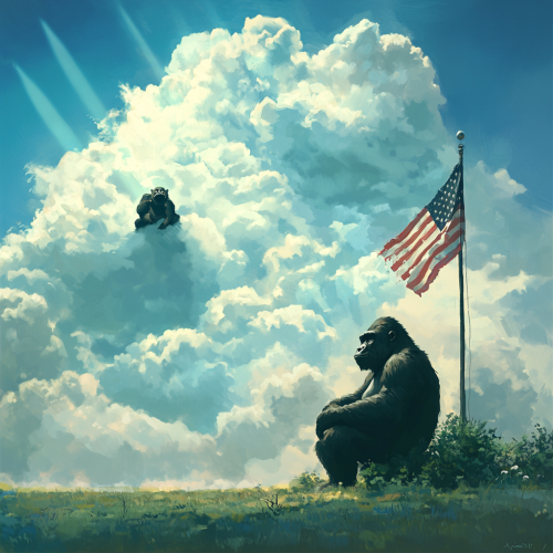 the force ghost of a squirrel and a gorilla, sitting together, on a cloud in the sky, looking down on a peaceful meadow with an single american flag waving in the breeze, hung from a flagpole