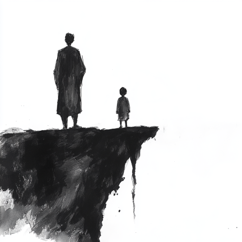 Create a minimalist ink sketch illustration, black on white background, showing the wise sage and the child standing side by side at the edge of a cliff, looking out over a vast, open landscape. The sage stands calmly with his hands behind his back, while the child stands in awe, gazing into the distance. Use simple, expressive brush strokes to capture a sense of openness, wisdom, and connection between the two figures. The scene should evoke a feeling of journey’s end and quiet reflection, with the focus on the bond between the sage and the child.