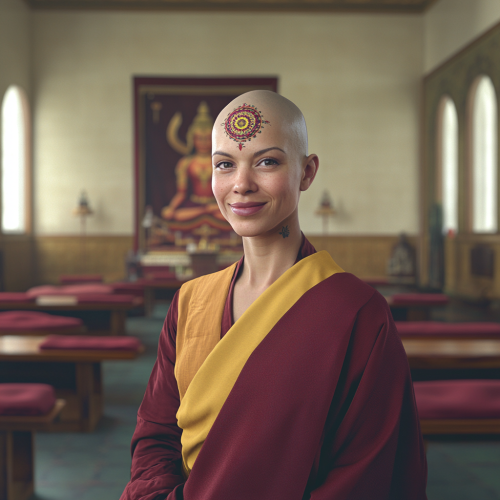 A Hindu priest or yogi seated in a meditative pose, contemplating the convergence of AI with ancient teachings, in a poster-style composition. Subtle digital circuits flow around the figure, merging with symbols like the Om, a glowing mandala, and lotus flowers. The background is rich in colors of saffron, green, and gold, creating a harmonious balance between spirituality and technology. --v 6.1 --ar 16:9