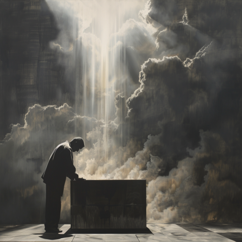 Job in prayer, head lowered and hands clasped in front of a large altar with smoldering sacrificial flames, seeking purification for his children. His expression is somber, with rays of morning light breaking through clouds, illuminating him softly. The surrounding area is sparse, reflecting humility and devotion. Photorealistic, atmospheric lighting, symbolic composition, textured surfaces, 9:16 --v 6.0