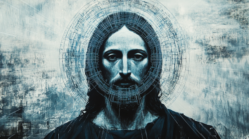 A black-and-white halo around a subtle icon of Christ, with a soft blue circuit pattern intertwined with the halo’s design, symbolizing spiritual and technological enlightenment. --v 6.1 --ar 16:9