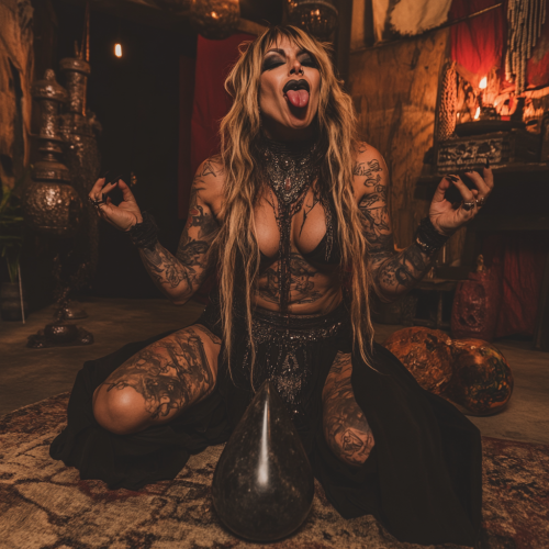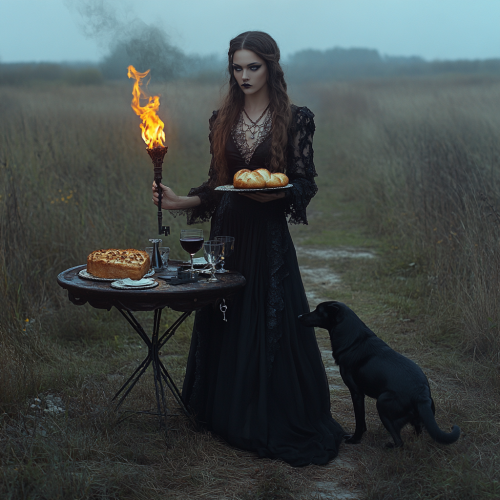 hyper-realistic photo Picture me of an ancient shaman standing in a mysterious misty forest. This sorcerer is a tall, dignified creature with a mask-like face with deep wrinkles, which contain wisdom and hidden power. His skin looks pale and ghostly, and dark shadows emphasize the contours of his face. The sorcerer is wearing a long robe of dark earthy color, and with a mixture of orange and red everywhere, he or she feels as if he or she has become one with nature. His or her head has twisted branches and a tall headdress decorated with small, shiny orange lanterns or fruits, giving off a mysterious glow. He or she holds a twisting wooden cane in one hand, symbolizing their deep connection to nature. Surrounded by dense, lush forest plants, soft mist spreads in the background, creating a surreal atmosphere.