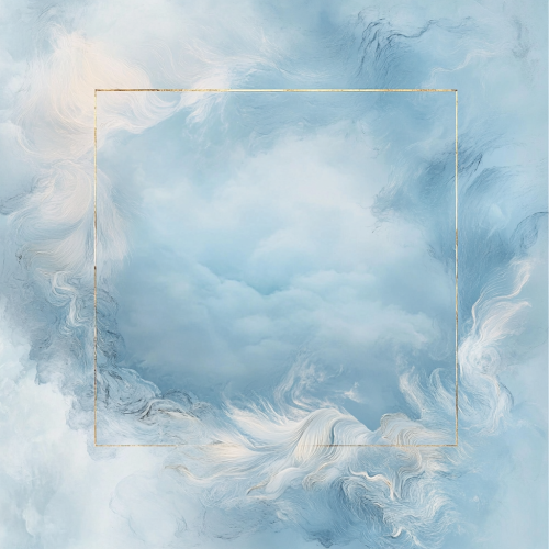 Create a minimalist, square-shaped outer border for an Air-themed spiritual card in 8K resolution, framing an open square center for text. The border features delicate, flowing lines inspired by soft breezes and wispy clouds, with fine gold accents. Use light blue and silver tones, adding airy and ethereal elements like faint feathers or mist that subtly outline the square. The style is refined and elegant, emphasizing freedom, clarity, and a luxurious, open aesthetic