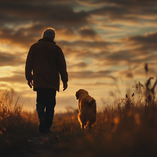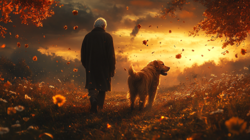 imaging ultra photorealistic 8k image showcasing the old man and old golden retriver are walking at a distance, heaveanly feeling, spritual lighting ,ar 16:9 --stylize 200