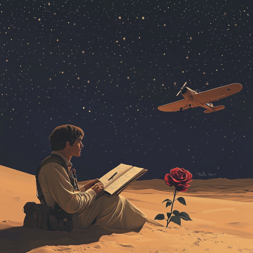 An inspiring, artistic illustration capturing Antoine de Saint-Exupéry in his iconic pilot attire, seated on the desert sands while making notes on a vintage notebook. The scene is set against a vast, open desert landscape under a night sky filled with stars, symbolizing exploration, solitude, and creativity. Subtle elements like the silhouette of a small plane and a delicate rose in the background nod to The Little Prince, adding a touch of nostalgia. The mood is reflective and imaginative, ideal for representing a writing journey inspired by Saint-Exupéry’s spirit of adventure.