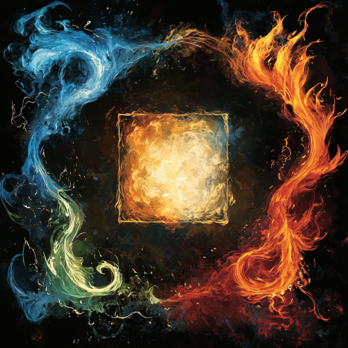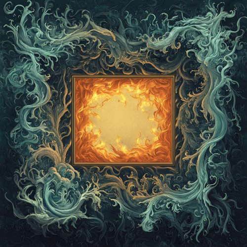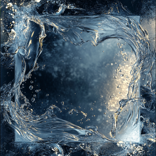 Design an avant-garde, square-shaped outer border for a Water-themed spiritual card in 8K resolution, framing a central square space for text. The border flows organically, with dynamic, liquid-like silver and deep blue streaks resembling water currents that almost appear to move. Incorporate subtle golden glints like sunlight hitting water, with iridescent, pearl-like droplets hovering in the border’s corners. The style is fluid, mystical, and elegant, evoking the quiet power and depth of water surrounding the open center