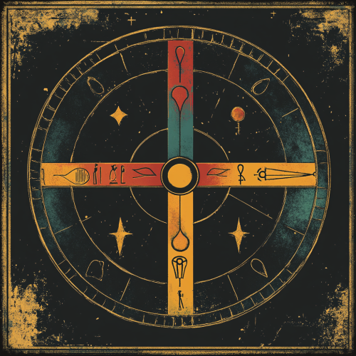 a logotype, with teh egyptian symbols of the ankh, djed pillar, kheper scarab, vesica pisces, orion constellation. Make it entrelaced and everything in a cercle