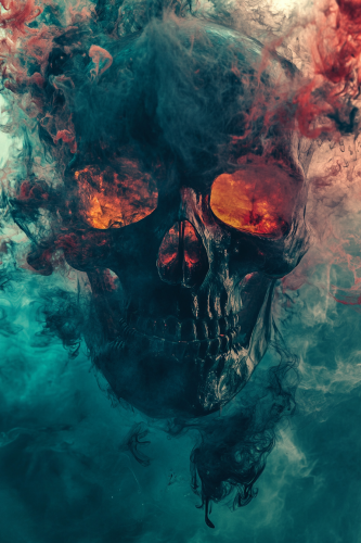 autostereographic and melancholic style, it shows a silhouette of glowing skull, the background looks like if you mixed up all diffrent oil colors, the colors mix up with the water, surreal art and melancholic, --ar 2:3 --v 6.1