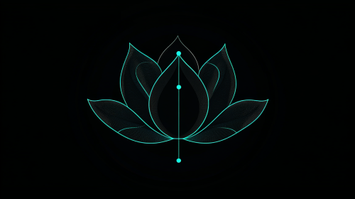 A minimalist lotus flower in black and white, with faint blue circuit lines embedded within the petals, symbolizing the union of AI and Buddhist teachings. A subtle glow at the center represents enlightenment. --v 6.1 --ar 16:9
