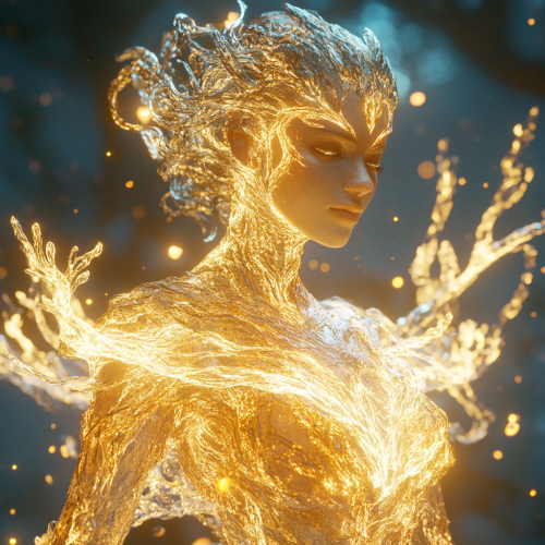 Design an ethereal, out-of-the-box Spirit-themed female character in 8K resolution, embodying unity and balance. Her presence combines the elements of Earth, Water, Fire, and Air--her skin glows subtly with golden light, her hair flows like mist touched with embers and soft roots. Her attire is adorned with gemstones, faint waves, and delicate feathers, creating a mystical, luxurious aura. Her gaze is wise and fierce, radiating harmony and a powerful, grounded elegance that unites all elements.