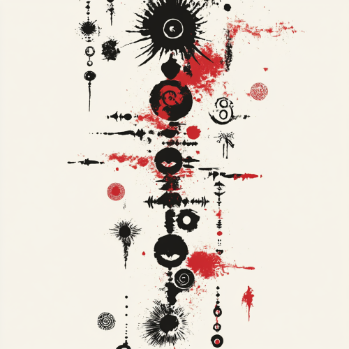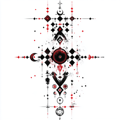 Vertical aspect ratio a design using red black white with scattered symbols forming a non-regular abstract figure representing strength decision courage intelligence and luck. ancient esoteric mystical symbol. White background