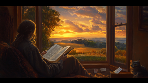 Depict a serene scene showing a person sitting by a window, gently holding an open Bible in their lap, while looking out at a peaceful, soft-lit landscape with a warm, comforting sunrise or sunset. The view through the window could feature a gently rolling landscape, symbolizing life’s journey, with soft, golden light breaking through clouds, creating a sense of God's comforting presence. Nearby, a card or a small stack of notes represents the support of the church family. A cat rests nearby, symbolizing small, unexpected joys that lift the spirit. The entire scene should convey peace, resilience, and the strength drawn from God’s promises, using Thomas Kinkade’s characteristic warm lighting and detail to evoke a hopeful and tender atmosphere. --ar 16:9