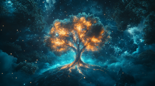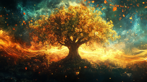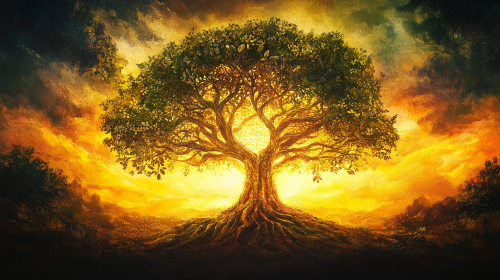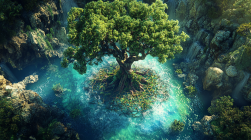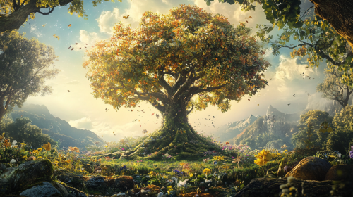 A highly detailed, high-resolution illustration and showcasing the sacred tree of life - cinematic wide angle - with intricate details and vibrant colors symbolizing the tree of life - The scene includes elements of nature, positivity, health, love to represent high vibration. The composition is dynamic and engaging, showcasing the blend of the sacred tree of life --ar 16:9