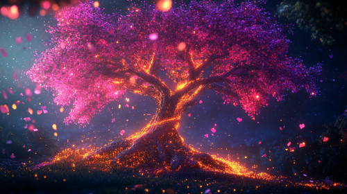 A highly detailed, high contrast - high-resolution illustration and showcasing the sacred tree of life - cinematic wide angle - with intricate details and vibrant colors symbolizing the tree of life - The scene includes elements of nature, positivity, health, love to represent high vibration. The tree is radiating out waves of healing energy - the tree is full of radiant energies flowing thruought - The composition is dynamic and engaging, showcasing the blend of the sacred tree of life --ar 16:9