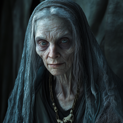 realistic picture of The Veil is an enigmatic figure, rarely appearing in a solid form. When visible, they take the shape of a tall, shadowy silhouette, their form slightly translucent and always shifting, with wisps of dark mist curling around them. Their face is obscured by a black hood, with only faint, glowing silver eyes visible, adding to the aura of mystery. Their attire is flowing, made of dark, shifting fabrics that seem to merge with the shadows, making it difficult to tell where their body ends and the darkness begins. Their movements are fluid and ethereal, as though they are not entirely bound by physical laws. They carry an ancient staff decorated with shards of obsidian and silver, signifying their status among the Shadelings.