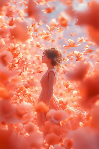 with warm hues of orange and pink. The scene feels peaceful and fulfilling, as if dreams have been realized. The presence of RALU is felt in the wind, leaving a lasting essence in every heartbeat, symbolized by the subtle pulse of light from the floating petals. --ar 2:3 --s 250