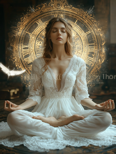 a woman in white dress lotus position meditating with a big clock behind, covered by a white pure aura, around this aurs is flying a time, --v 6.1 --ar 3:4 --q 2 --stylize 1000