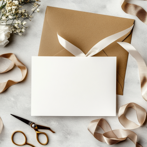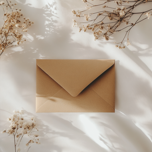 A flat lay of a horizontal greeting card with a brown kraft envelope behind it. The card is surrounded by soft, natural elements like small dried flowers, greenery, and neutral stationery items. Natural lighting casts gentle shadows, highlighting the texture of the kraft paper and cardstock. The background is a soft, neutral color, creating a clean and inviting aesthetic. Photorealistic details, carefully arranged for a balanced, modern look.