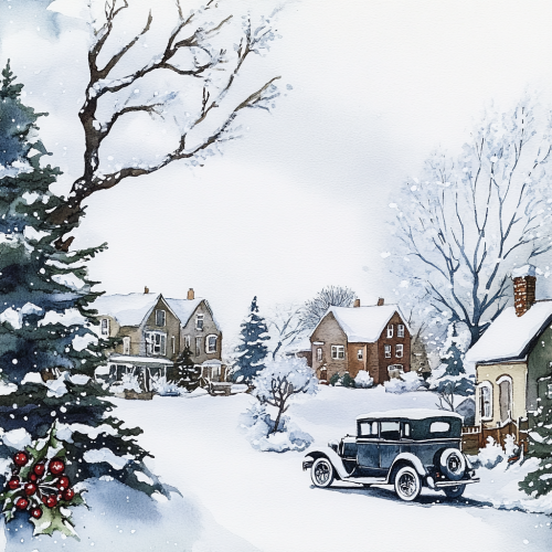 Create a sheet of stationery on stark white paper. Create a small corner border of Alcohol ink splashes in light blue, pale silver and white, whimsical Christmas winter wonderland with 1920’s vintage car sitting in a charming neighborhood. Place small corner border at the very bottom edge righthand corner of each stationery sheet.