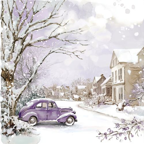 Create a sheet of stationery on stark white paper. Create a small corner border of Alcohol ink splashes in light purple, pale silver and white, whimsical Christmas winter wonderland with purple 1940’s vintage car sitting in a charming neighborhood. Place small corner border at the very bottom edge righthand corner of each stationery sheet.