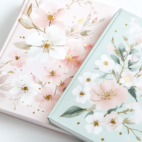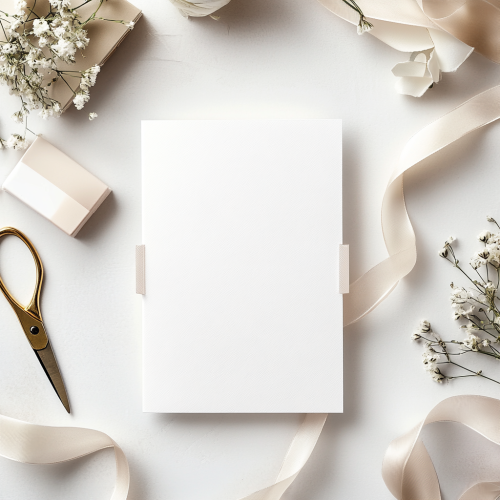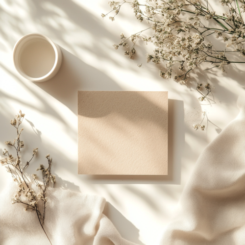 A flat lay of a horizontal greeting card. The card is surrounded by soft, natural elements like small dried flowers, greenery, and neutral stationery items. Natural lighting casts gentle shadows, highlighting the texture of the cardstock. The background is a soft, neutral color, creating a clean and inviting aesthetic. Photorealistic details, carefully arranged for a balanced, modern look.