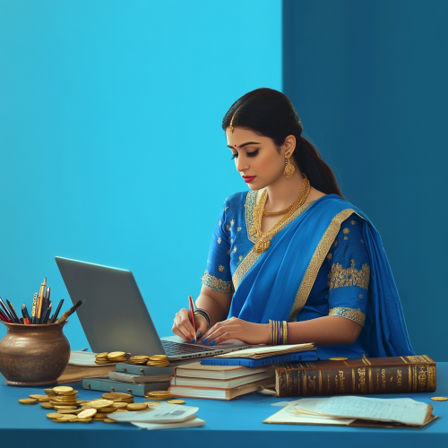 A woman in a blue sari, sitting on his desk and writing a novel in Laptop, stationery items like pens, papers, books, also on his desk, a pot filled by gold coin and some stationery pens, papers, surrounded on floor, blue background and one book rack on wall Backward view 8k huyper realistic