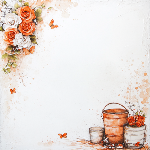 Create a sheet of stationery on stark white paper. Create a small corner border of Alcohol ink splashes in light orange, cream and white, whimsical of orange and white rose entwined with an old well, buckets orange butterflies . Place small bottom border at the very bottom edge right and corner of each stationery sheet