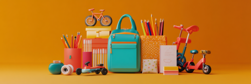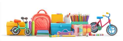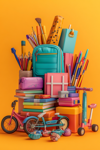 Create a realistic image featuring all the products sold in a children's stationery and toy store. Arrange the items as a package or bundle in the center of the image, neatly stacked or grouped together. Include one item from each category: a colorful backpack, a notebook, pencils, a bicycle, a scooter, a toy car, children's books, art supplies (paintbrushes, colored pencils), and small gift boxes. The background should be clean and simple white, with minimal distractions, and the products should appear vibrant and realistic, positioned closely together as one cohesive bundle --ar 3:1