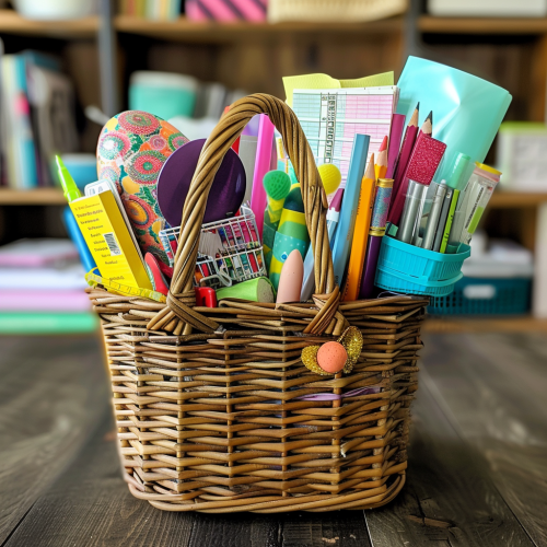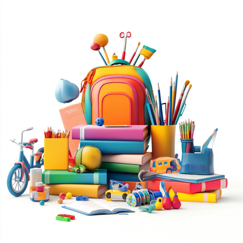 Create a realistic image featuring all the products sold in a children's stationery and toy store. Arrange the items as a package or bundle in the center of the image, neatly stacked or grouped together. Include one item from each category: a colorful backpack, a notebook, pencils, a bicycle, a scooter, a toy car, children's books, art supplies (paintbrushes, colored pencils), and small gift boxes. The background should be clean and simple white, with minimal distractions, and the products should appear vibrant and realistic, positioned closely together as one cohesive bundle