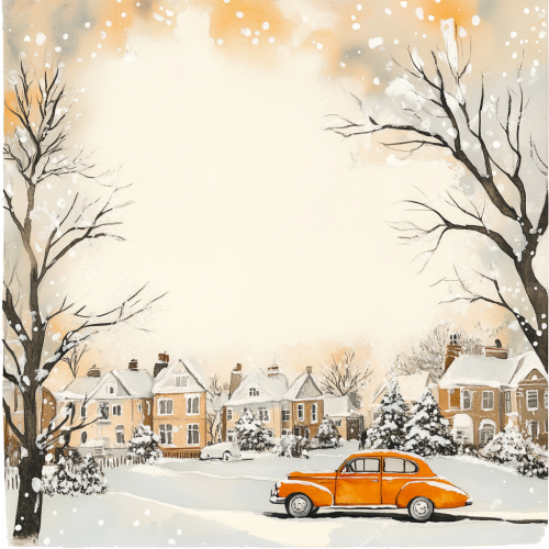 Create a sheet of stationery on stark white paper. Create a small corner border of Alcohol ink splashes in light orange, pale silver and white, whimsical Christmas winter wonderland with orange 1950’s vintage car sitting in a charming neighborhood. Place small corner border at the very bottom edge righthand corner of each stationery sheet.