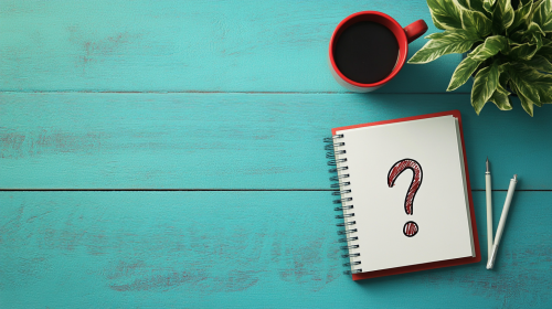 A creative flat-lay of a notebook, plant, and coffee cup on a desk with a question mark doodled on the notebook, suggesting brainstorming. Flat-lay image of a desk with a notebook, pen, coffee cup, and small plant. Red and blue accent colors. Keywords: minimalist, creative, brainstorming. Camera: Smartphone, Lens: Standard. Post: Bright, flat design with soft shadows. --ar 16:9