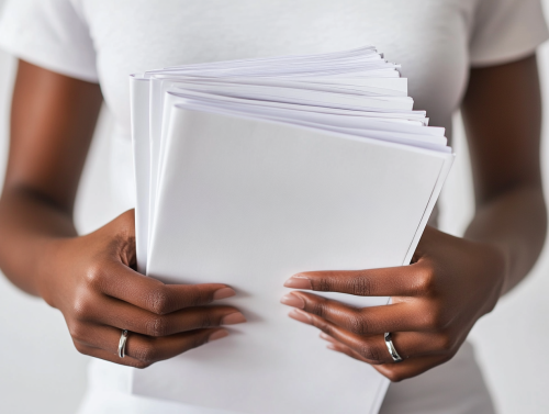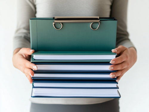 A woman holding office stationery, white background, photo taken from the front of an A4 sized stack of digital documents with metal rings on top, holding in her hands a large dark blue and light green plastic file open at one edge, focusing attention to a well-filled cinematic-themed document. The focus is on creating a professional atmosphere for work by adding details such as the items being neatly arranged against a clean white backdrop. --ar 4:3