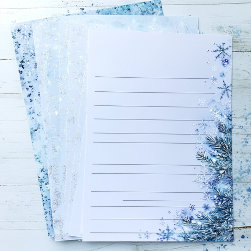 Create 4 different sheets of lined stationery on stark white paper. Lines centered and evenly spaced horizontally. Create a small corner border of Alcohol ink splashes in light blue, pale silver and white, whimsical Christmas winter snowflakes, in 4 different poses. Place small corner border at the very bottom edge righthand corner of each stationery sheet.